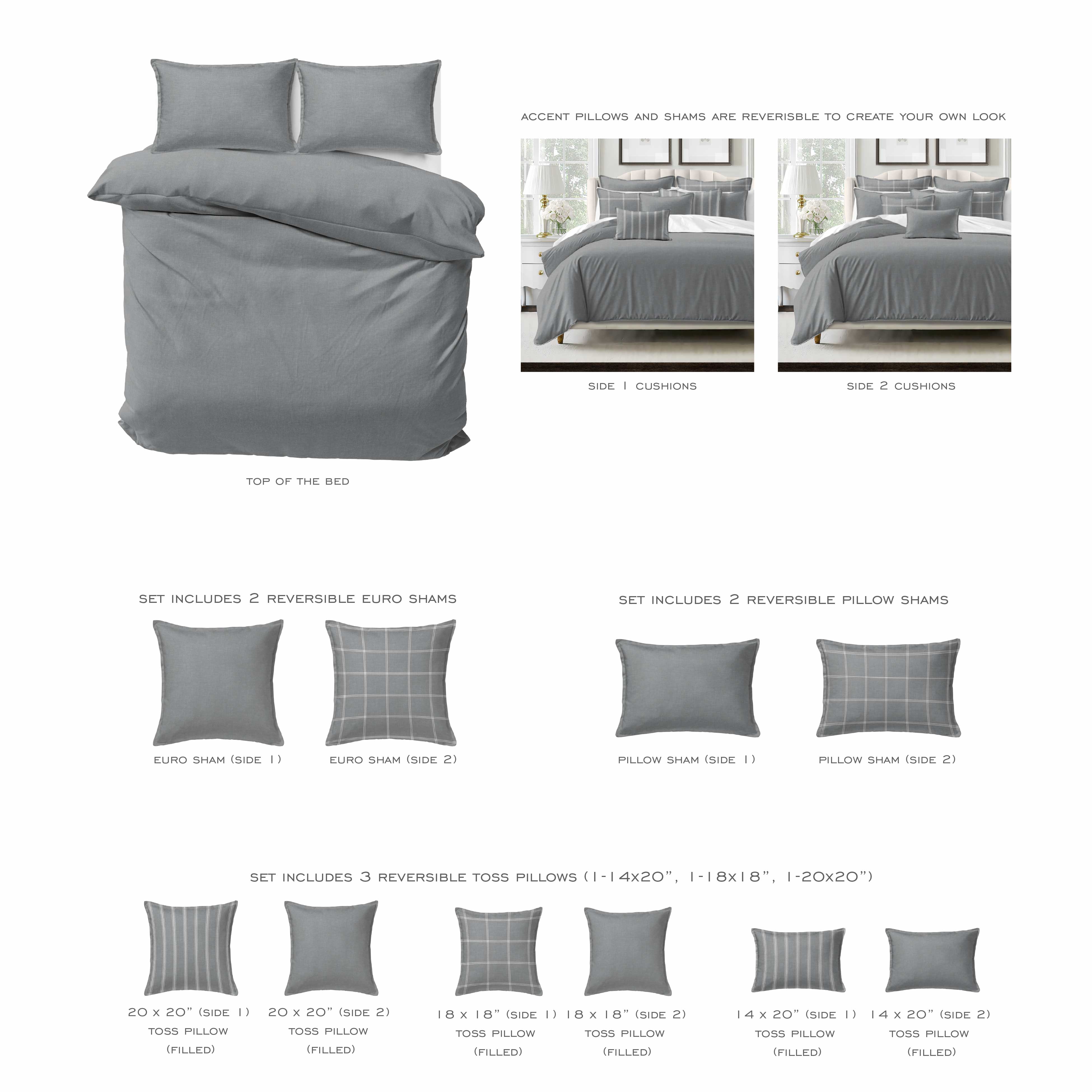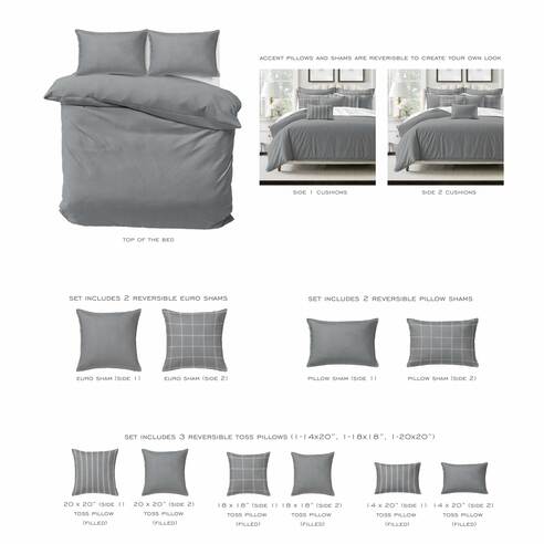- Designer Set Options: Choose from a Duvet Cover, Coverlet or Comforter, plus 2 Pillow Shams, 2 Euros, & 3 Bonus Decor Pillows (filled)