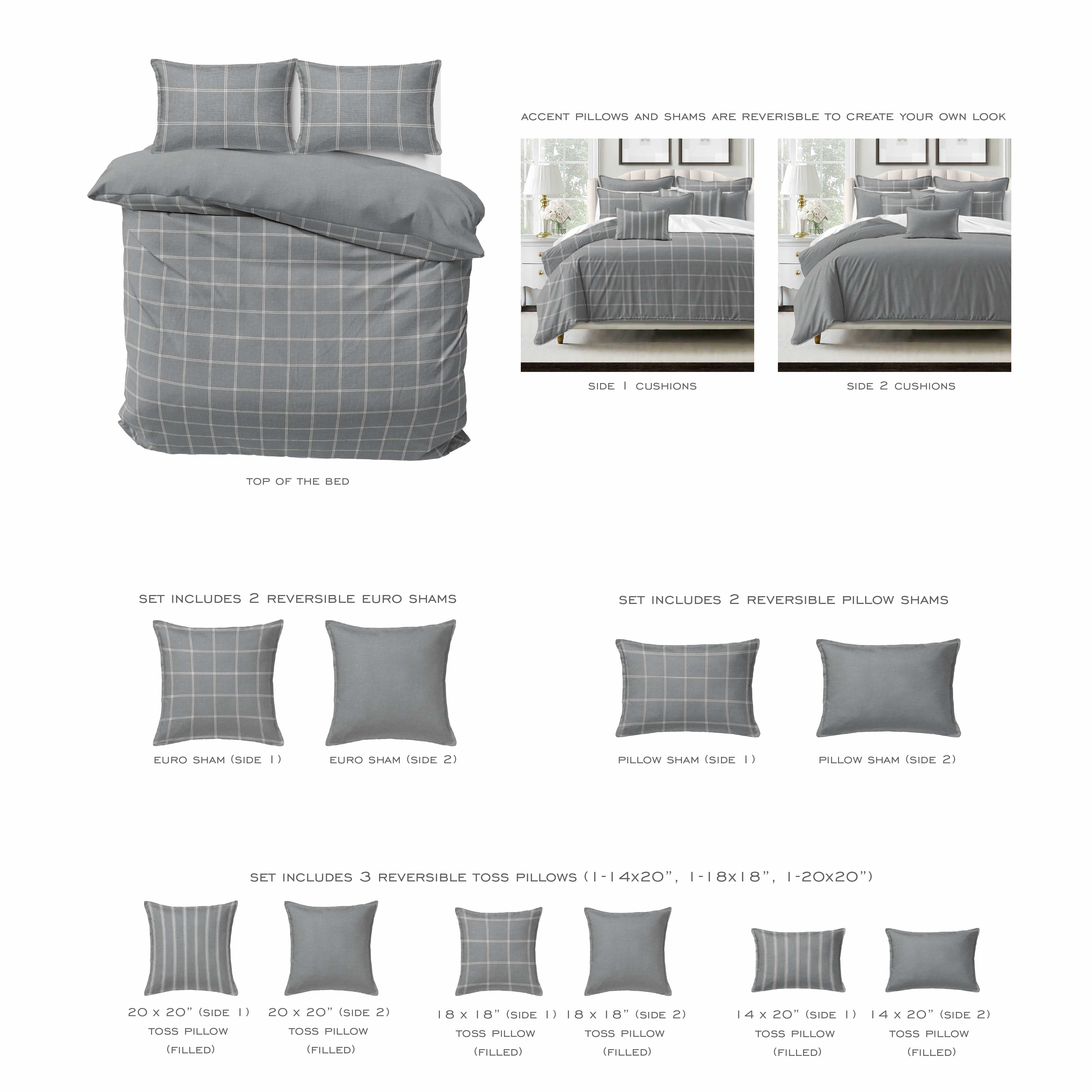 - Designer Set Options: Choose from a Duvet Cover, Coverlet or Comforter, plus 2 Pillow Shams, 2 Euros, & 3 Bonus Decor Pillows (filled)